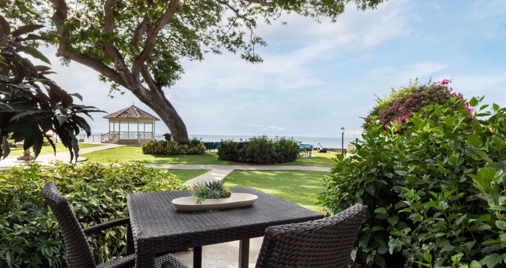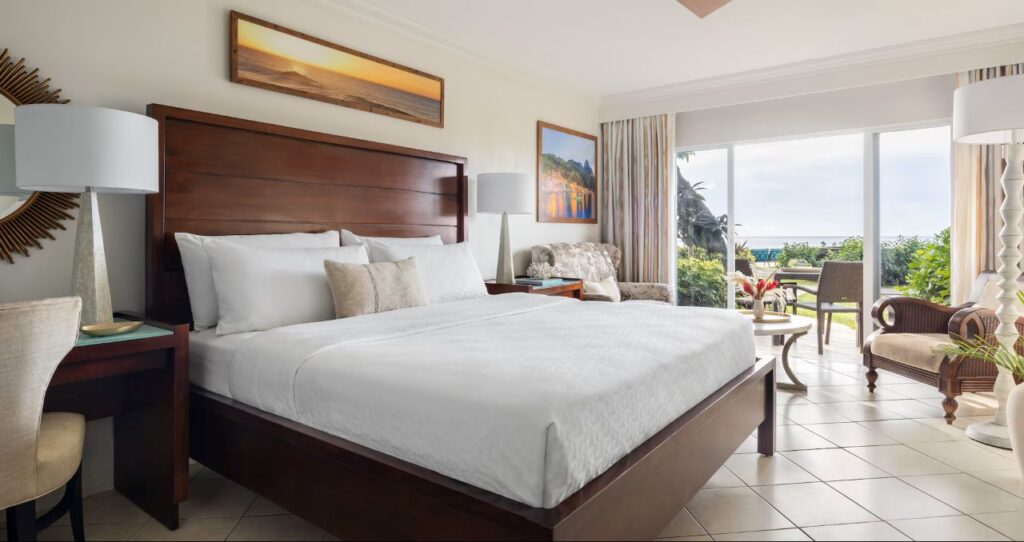 Located just steps from the sand, this room has a private walkout patio surrounded by tropical foliage. It features a table and chairs, while inside you’ll find a plush mahogany king bed, a sitting area, a smart TV, and an ensuite bath with a walk-in shower.