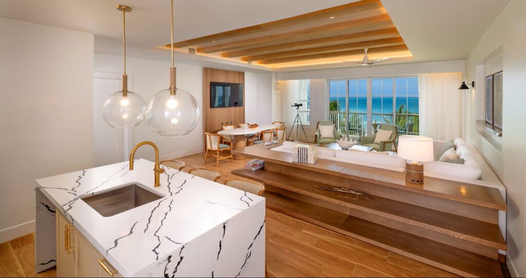 This serene suite has three bedrooms, a living room, and three and a half bathrooms. It sleeps up to twelve people. The beachfront furnished balcony offers views of the ocean while the private rooftop deck offers more expansive views plus comfortable seating, a dining set, and an outdoor kitchen.