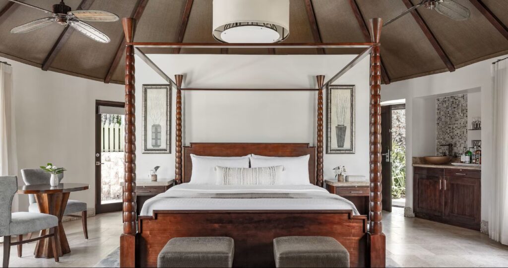 The interior offers a 4-poster king bed, smart TV, sitting area, bistro set, and wet bar, as well as an ensuite bath with a Roman soaking tub, a walk-in shower, and a double vanity.