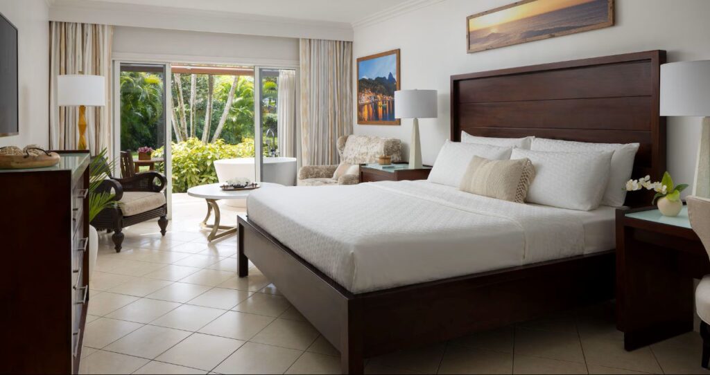 This newly renovated junior suite has tropical garden views and a private patio with walkout access, a Tranquility Soaking Tub for two, bistro set, and privacy curtains. The interior has a plush mahogany king bed, a sitting area, a smart TV, and an ensuite bath with a walk-in shower.