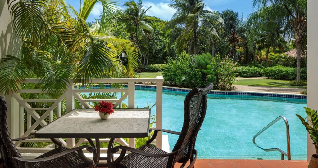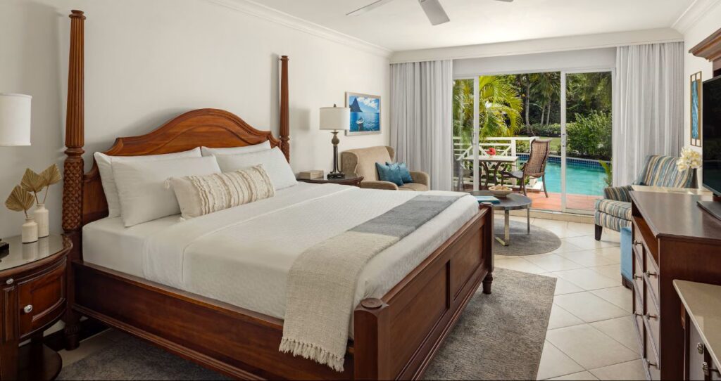 This room has tropical garden and pool views, with a walkout patio that offers direct access to the lagoon pool plus a bistro set. Inside is a plush king bed, sitting area, flat screen TV, and ensuite bath with a shower/tub combination or a shower.